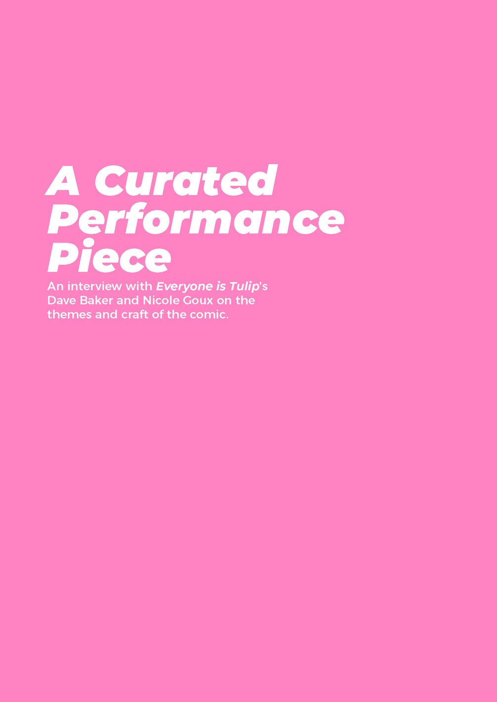 Each issue has two halves. The first, a focus on a particular comic and featuring a series of essays, interviews, and process pieces all focused around that comic. The 48th issue features Dave Baker and Nicole Goux's